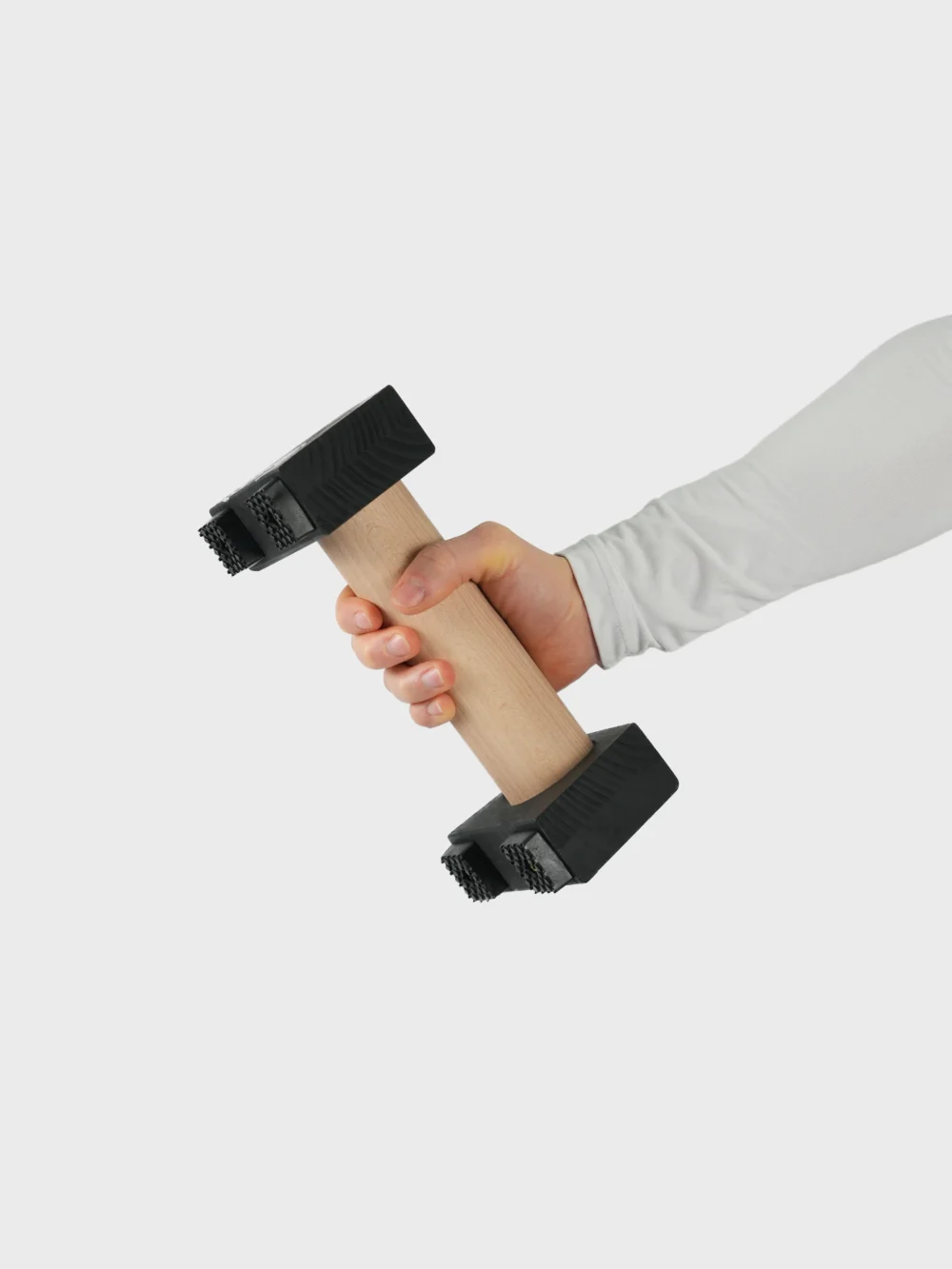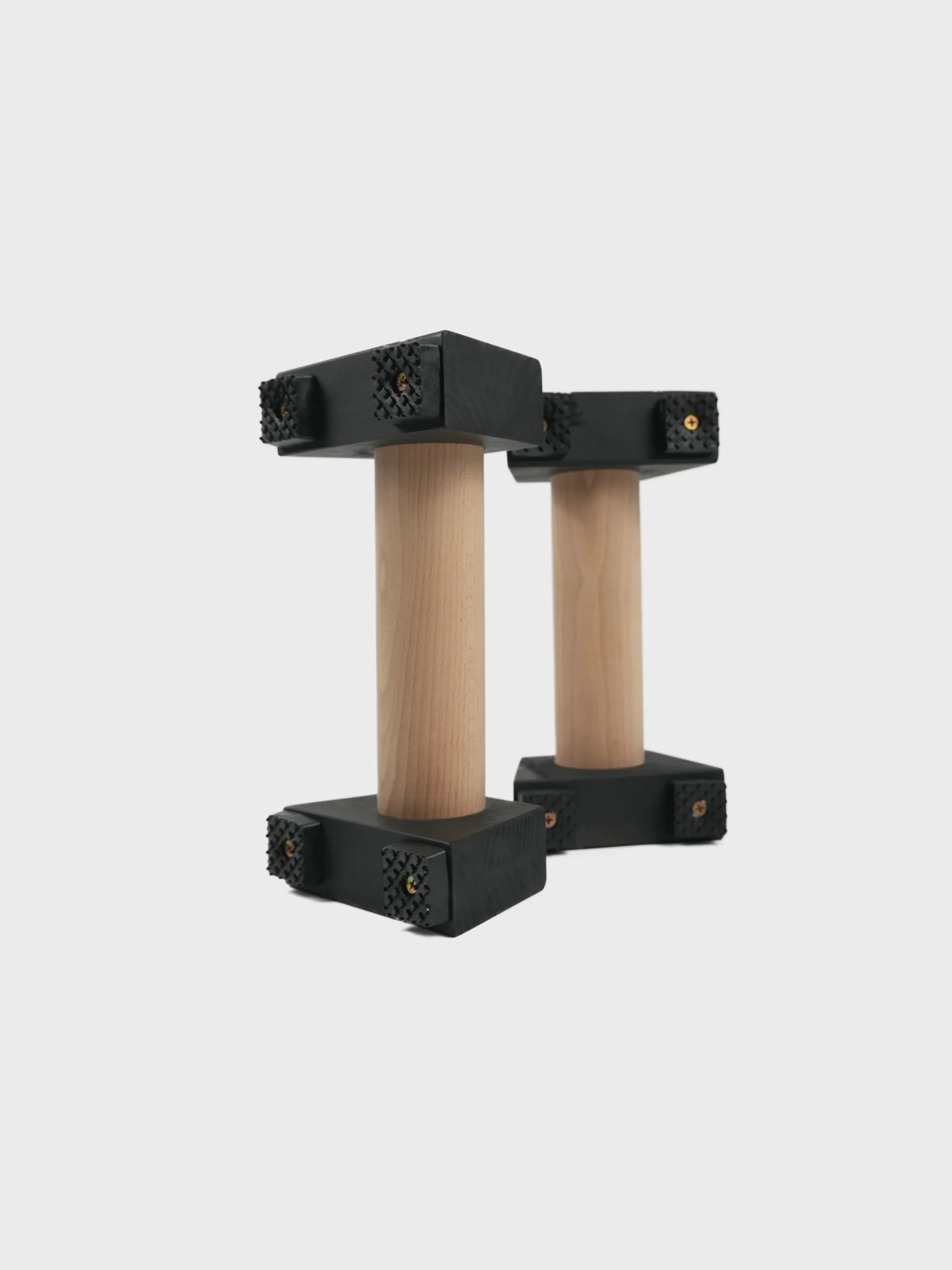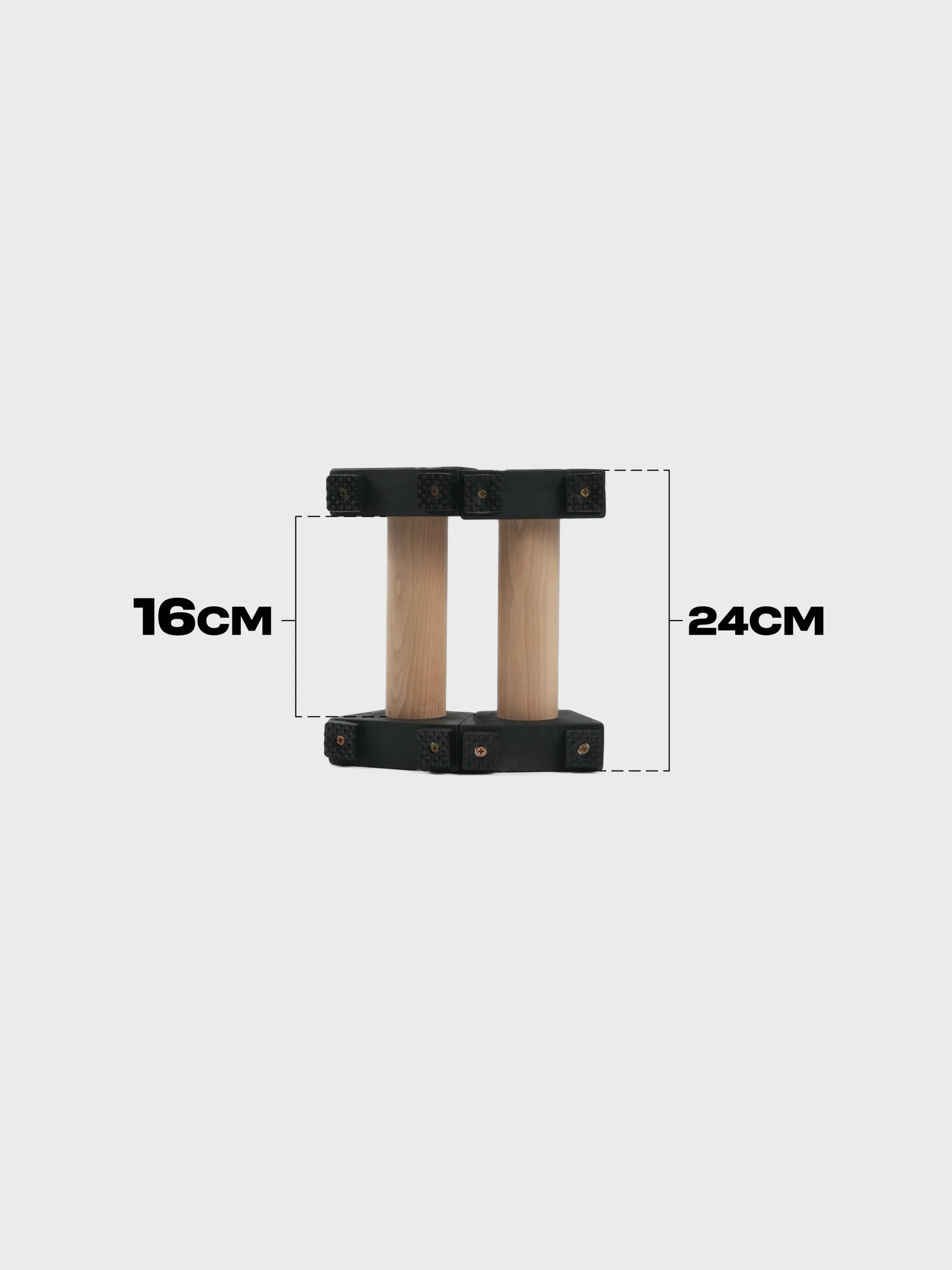 The core of these parallettes is a 16cm long beech wood handle with a 5cm diameter, specifically chosen to provide a more ergonomic grip. This thicker diameter distributes pressure more evenly across the palm, ensuring your grip remains secure.